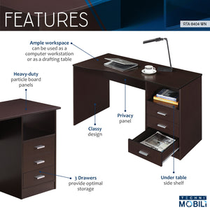 LONG DESCRIPTION : The Techni Mobili Classy Desk has a classy design of an expansive contoured desktop shape, and can be used as a computer workstation or as a drafting table. The under table side shelf and three drawers provide optimal storage. Desktop has a 90 lbs. weight capacity, the under table shelf can hold up to 19lbs and each drawer, 10lbs. Made of heavy-duty particle board panels with a moisture laminate finish, this desk will bring an elegant touch to any room or office. Color: Wenge