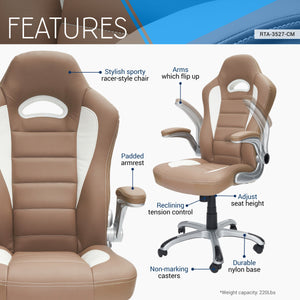 LONG DESCRIPTION : The Techni Mobili Sport Race Chair, is perfect and modern for the Executive of the company. It has an eye-catching racer style camel and white upholstery colors, durable nylon base and padded arms which flip up so you can push it just under the table top. This racer series chair fits users up to 220lbs featuring a pneumatic seat height adjustment, a locking tilt control and adjustable tilt tension providing optimal comfort and durability all in a modern sleek design. Color: Camel