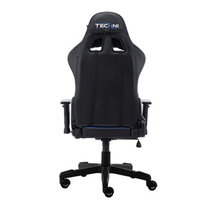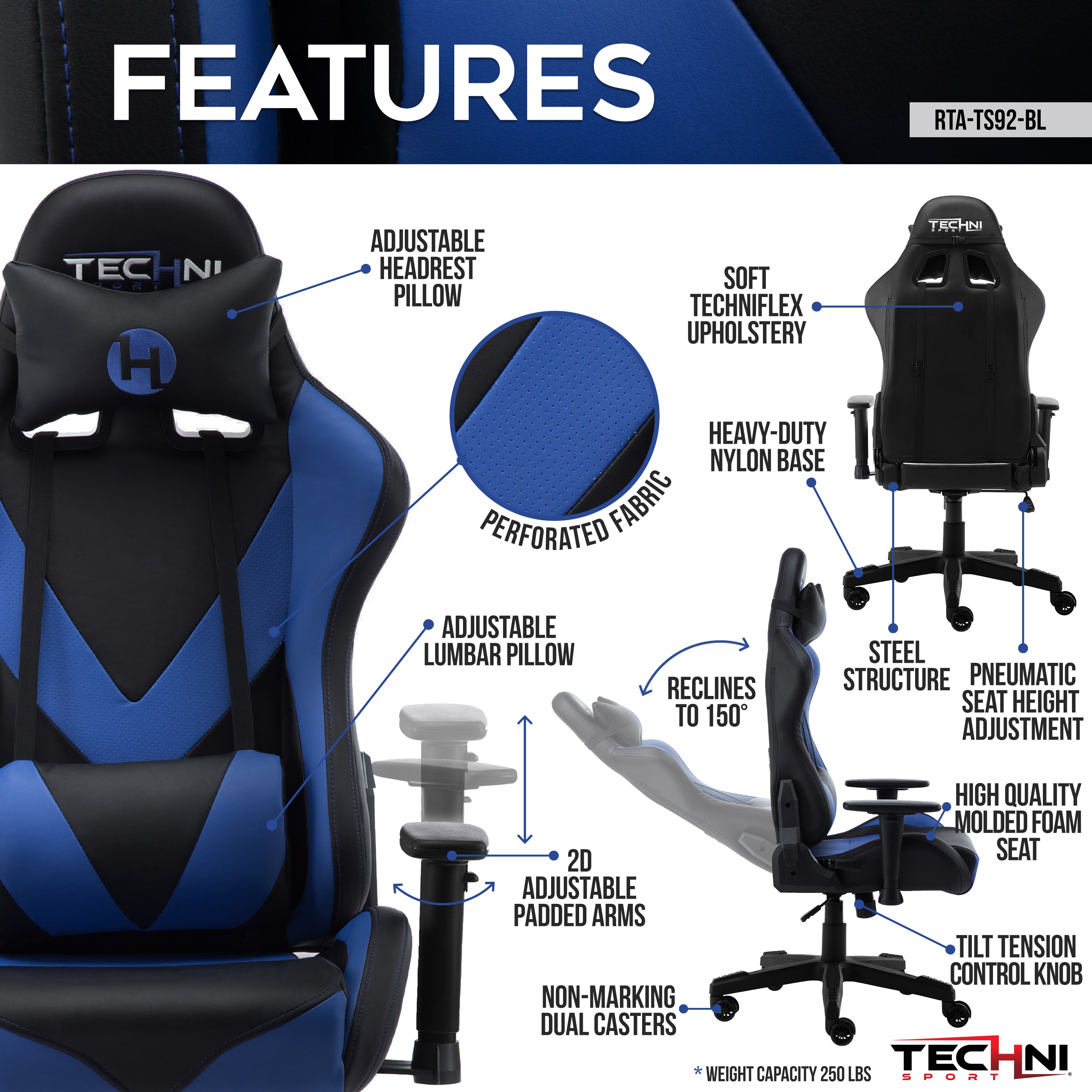 LONG DESCRIPTION : Add a classy touch to your gaming station with our blue/black gaming chair. It is sturdy and comfortable, has durable nylon base and is well cushioned to support your back. This high back chair comes in two tone accents, outlining the curves of the chair. Made with rich and durable PU, contoured segment memory-foam padding, includes neck and lumbar support pillows, adjustable 2D padded armrests and the pneumatic seat height adjustments make its look complete. Features tilt with tension control and 150 degree reclining mechanism and a 5-star durable nylon base with non-marking casters allows you to glide with ease. This chair supports 250lbs of weight limit and comes with 2-year limited warranty.